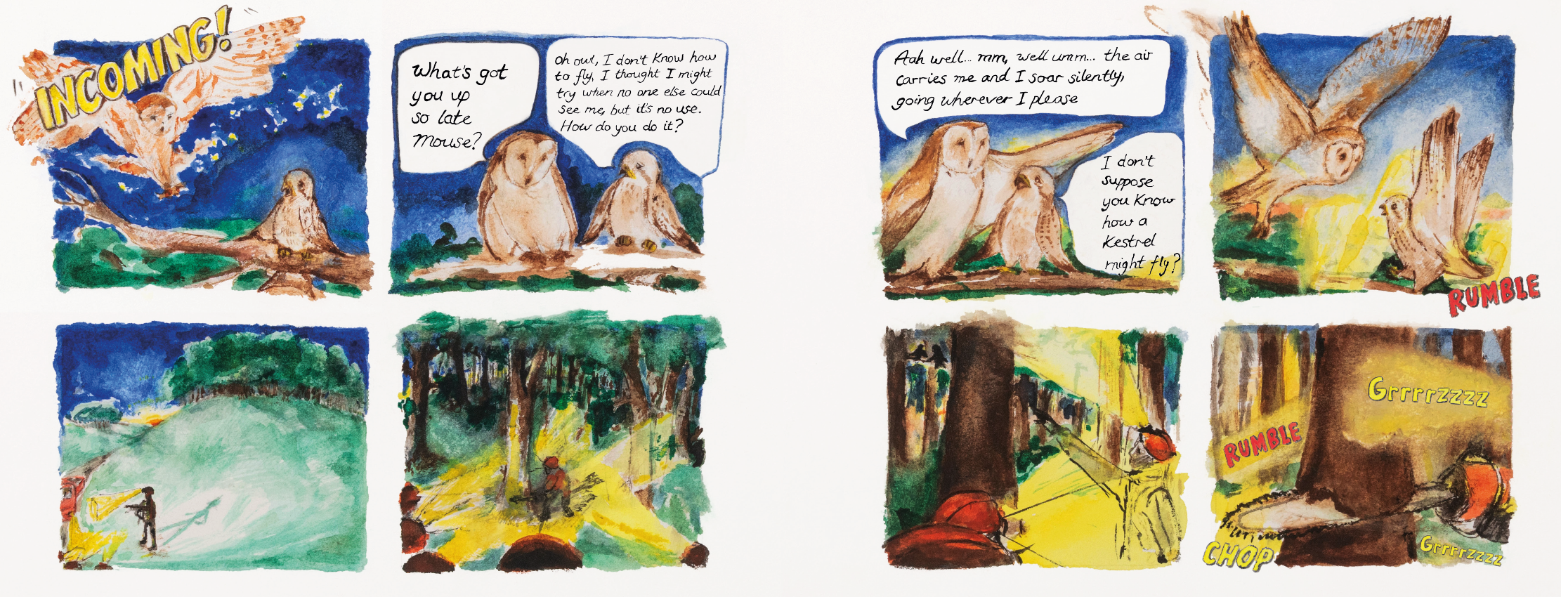 'Mouse the Kestrel' is a 48 page hand painted children's picture book, starring a Kestrel, set in a woodland. The tale is based loosely on two true events, which happened at a farm and woodland in the Scottish Borders between 2019-2020. The first event was a kestrel who fell from its nest and damaged its wing. The second event happened in the woodland behind the farm, which was due to be cut down when it was saved from destruction by its inhabitants who rescued their home in a remarkable way. Included in the book are themes of; nervousness, friendship, kindness, empathy, comedy, action and eco adventure.